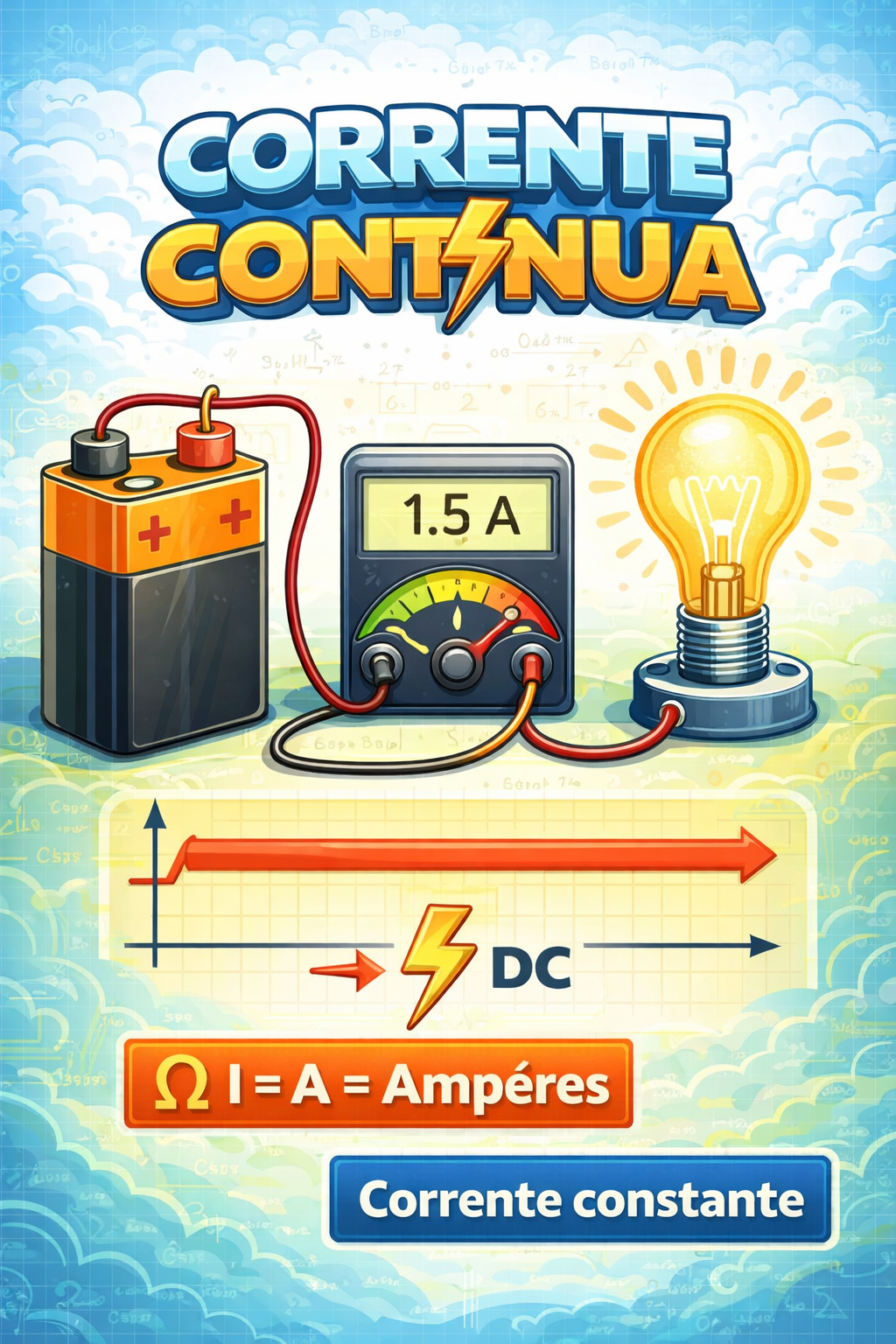 A corrente contínua é o movimento ordenado de cargas elétricas que ocorre sempre em um único sentido. Ela é comum em pilhas, baterias e fontes de alimentação eletrônicas.