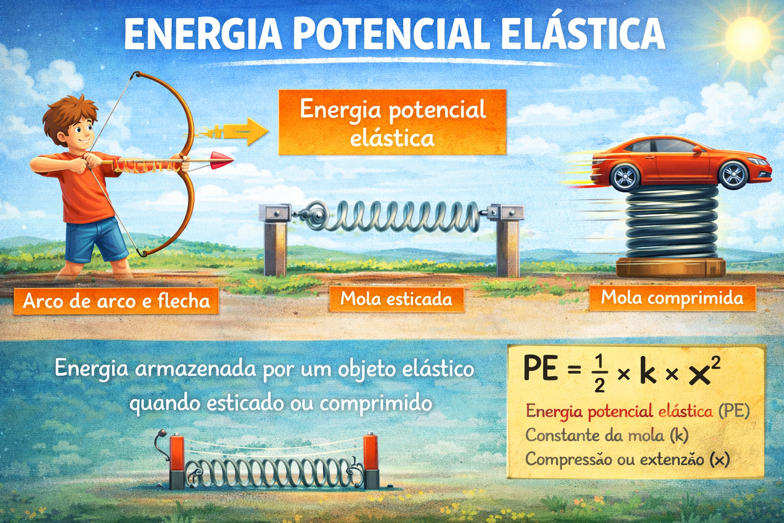 A energia potencial elástica é a energia armazenada em um corpo quando ele sofre deformação devido à ação de uma força. Essa deformação pode ocorrer por compressão, distensão ou torção, e é característica de materiais elásticos, como molas, borrachas e elásticos, que possuem a capacidade de retornar à sua forma original após a remoção da força aplicada.