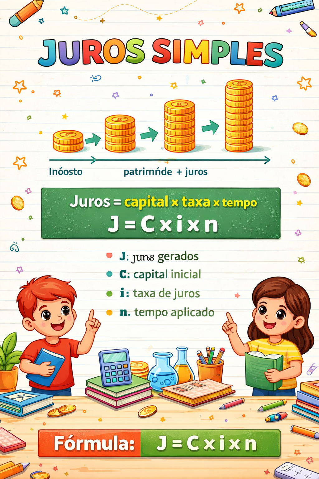Estudantes aprendem a usar juros simples para desenvolver habilidades de raciocínio lógico, compreensão de matemática financeira e tomada de decisões sobre dinheiro.