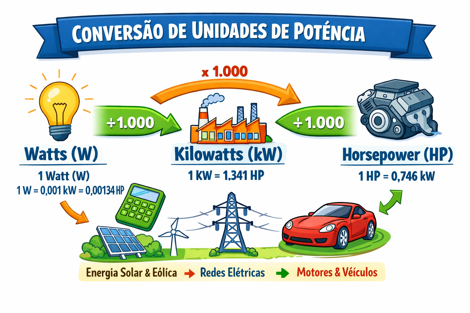 - Para potência elétrica, kW e MW são comuns; para motores de veículos, CV ou hp são mais utilizados.