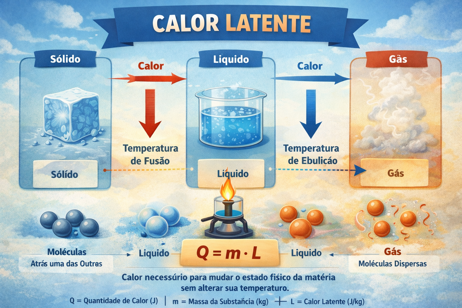 O calor latente é a quantidade de energia térmica que uma substância precisa absorver ou liberar para mudar de estado físico sem que sua temperatura mude. Isso significa que, durante a fusão, vaporização ou outras mudanças de estado, a temperatura da substância permanece constante, mesmo que esteja recebendo ou perdendo calor. Esse fenômeno acontece porque a energia fornecida não é usada para aumentar a agitação das partículas, como ocorre no aquecimento comum. Em vez disso, ela serve para romper ou formar ligações entre as moléculas, permitindo que a matéria passe de sólido para líquido, ou de líquido para gás.