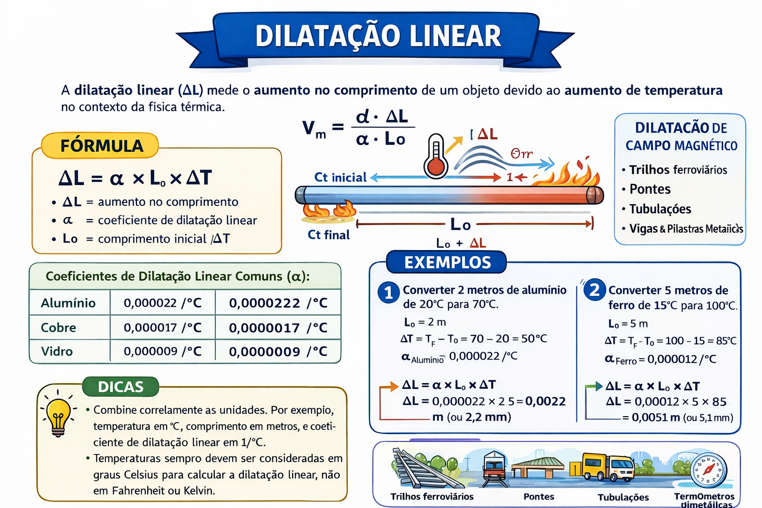 Compreender a dilatação linear é essencial em diversas áreas da engenharia, permitindo projetar estruturas e componentes capazes de suportar variações térmicas sem comprometer a segurança e o desempenho. Dessa forma, esse fenômeno se torna um ponto fundamental no estudo dos materiais e na aplicação de soluções técnicas eficientes.