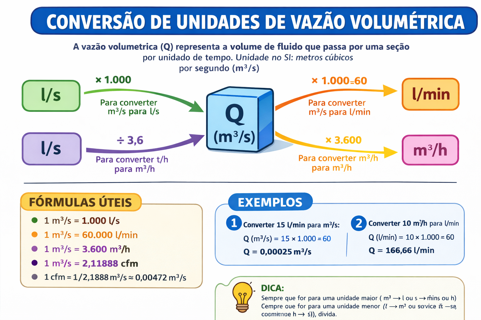 Com estas informações, você poderá converter facilmente vazão volumétrica entre m³/s, l/s, l/min, m³/h e gal/min, garantindo precisão em cálculos e projetos.