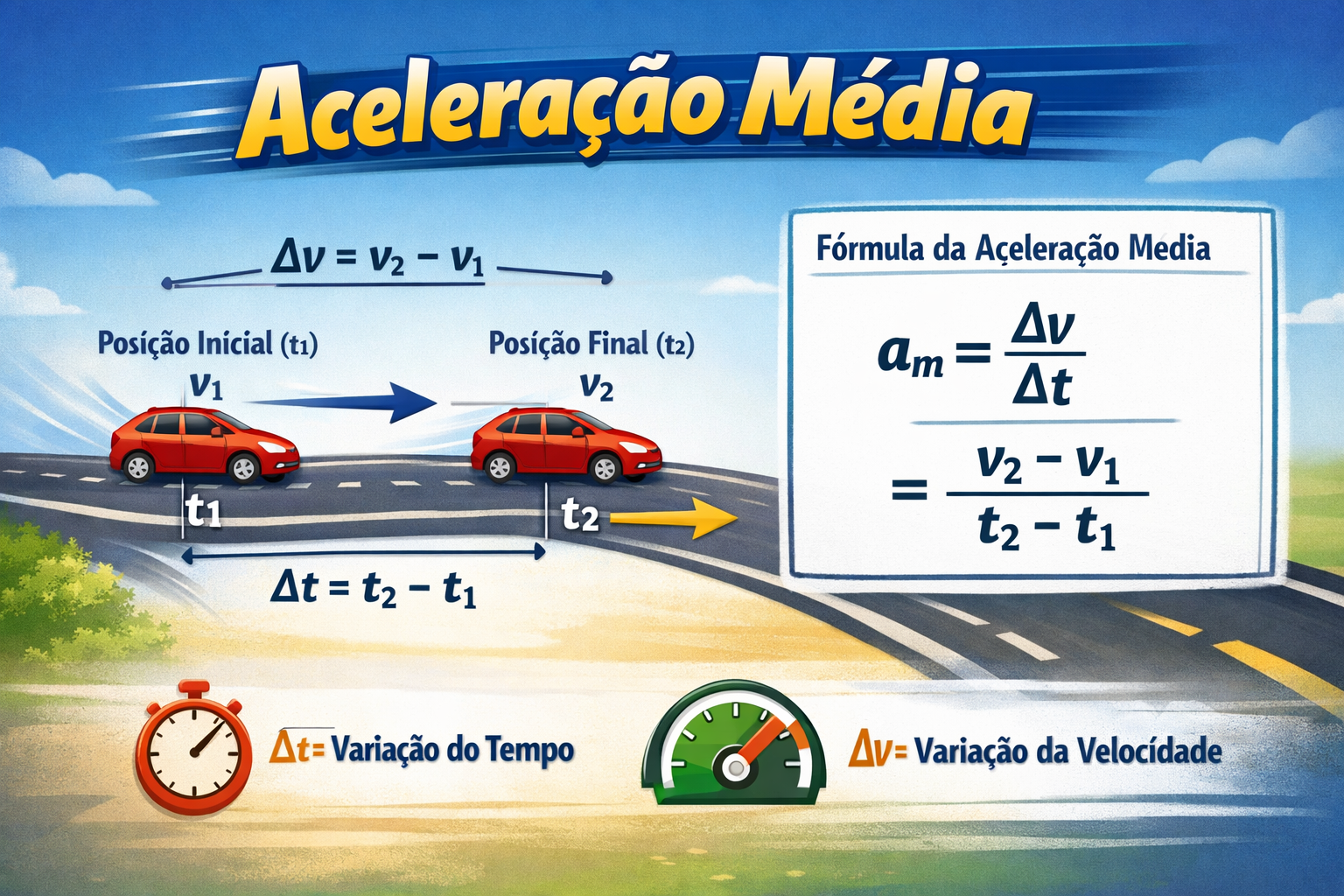 A aceleração média é uma grandeza física que descreve a variação da velocidade de um corpo ao longo de um intervalo de tempo. Em termos simples, ela indica o quanto a velocidade muda e quão rapidamente essa mudança ocorre. Para calculá-la, utiliza-se a expressão: